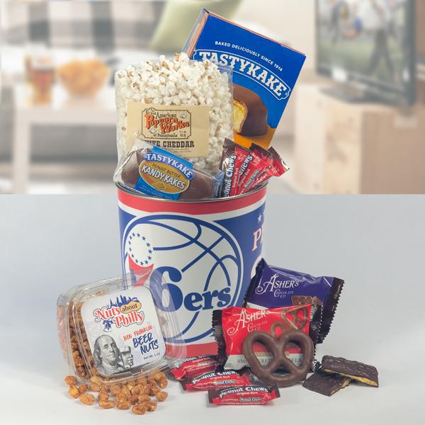 Rooting for the home team builds an appetite. Keep your favorite Philly sports fan happy with a 76ers gift tin filled with Cheddar Cheese Popcorn, Chocolate Covered Pretzels, Society Hill Toffee Peanuts, Tastykake Peanut Butter Kandy Kakes and Goldenberg's Peanut Chews in an officially licensed one gallon tin with a lid.