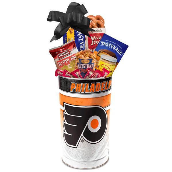 We arrange Tastykake Butterscotch Krimpets, Peanut Butter Kandy Kakes, Uncle Jerry's Hard Pretzels, Betsy Lantz Dipping Mustard, Keystone Crunch, Herr's Potato Chips and Goldenberg's Peanut Chews in this Flyers tin.