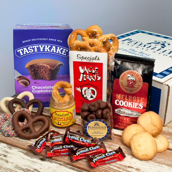 Enjoy a true taste of Pennsylvania with this sampler of local favorites! Featuring Wilbur Buds, Uncle Jerry’s Hard Pretzels, Betsy Lantz’s Dipping Mustard, Philly's Melrose Diner Butter Cookies and more, this gift box is packed in our signature Pennsylvania General Store gift box with Keystone State tradition.
