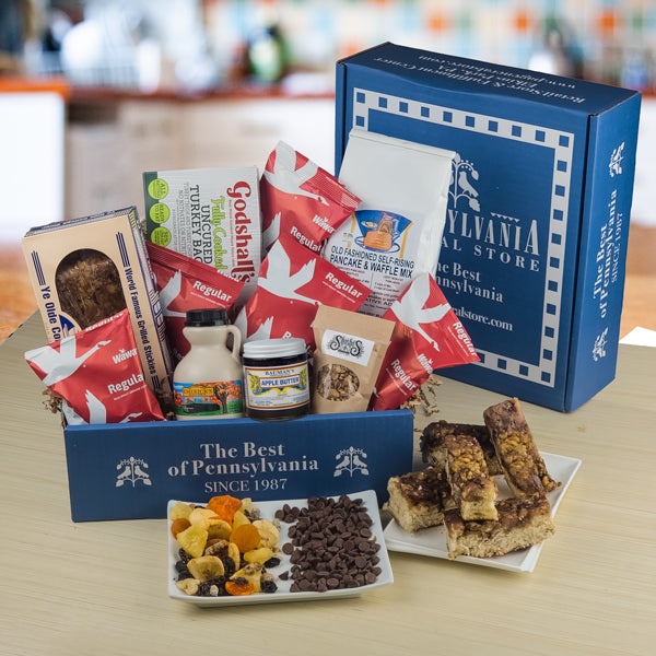 This breakfast-themed gift package is a thoughtful and delicious way to show your appreciation! With Wawa Coffee, a beloved Philly staple, it starts the morning off right. Burnt Cabin Buttermilk Pancake Mix paired with Pennsylvania Maple Syrup promises a classic and hearty breakfast, and Wilbur's Semi-Sweet Chocolate Chips add a touch of indulgence to pancakes or baking. Shosho's Kitchen Granola and dried fruit offer healthy and tasty options, while the famous Grilled Stickie Buns from Ye Olde College Diner bring a sweet, nostalgic treat. Bauman's Apple Butter gives a rich, traditional spread, and Godshall's Precooked Turkey Bacon rounds out the package with a savory bite. Perfect for a special breakfast feast!
