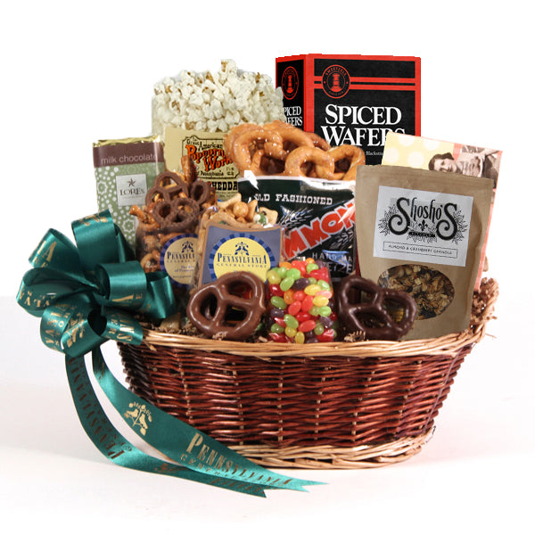 This basket is a delightful collection of snacks, offering the perfect balance of sweet and savory treats! From Hammond's Pretzels and Lore's Chocolate Covered Pretzels, to Shosho's Kitchen Granola and Sweetzel's Spiced Wafers, there's Rosie's Butterkin cookies that are melt in your mouth delicious, Popcorn Loft's White Cheddar Popcorn made with real cheese no cheesy powder, a rich milk chocolate candy bar handmade by Lore's Chocolates, Mike & Ike fruit candy treats, and our Nine Variety Pretzel Mix! A thoughtful gift that’s sure to please any crowd.