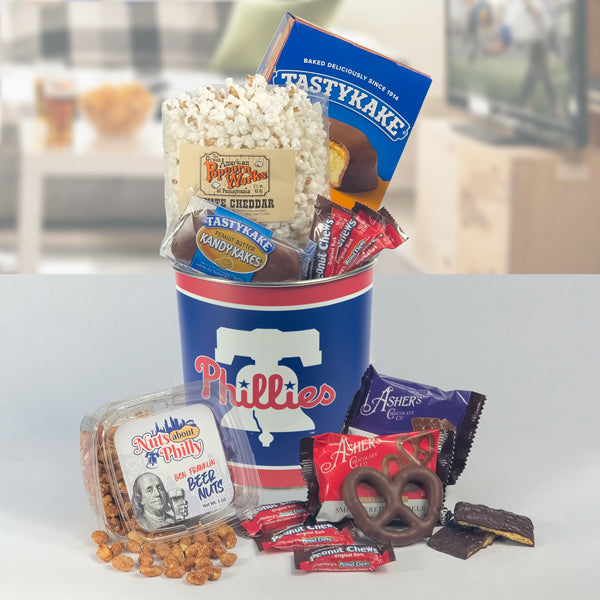 Rooting for the home team builds an appetite. Keep your favorite Philly sports fan happy with a Phillies gift tin filled with Cheddar Cheese Popcorn, Chocolate Covered Pretzels, Society Hill Toffee Peanuts, Tastykake Peanut Butter Kandy Kakes and Goldenberg's Peanut Chews in an officially licensed one gallon tin with a lid.