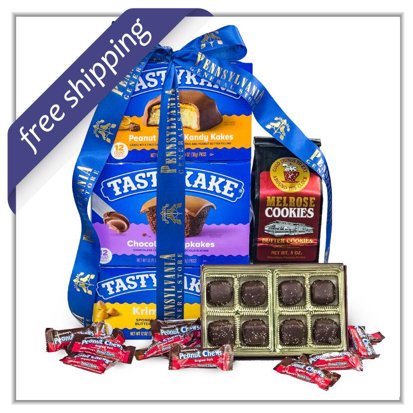 Send a little bliss from the City of Brotherly Love—because nothing says “thinking of you” like a tower of Philly sweets! This basket ships Free!