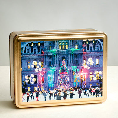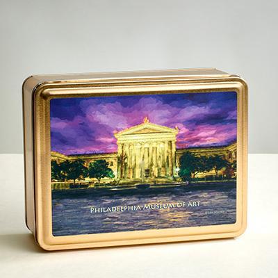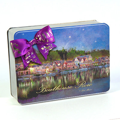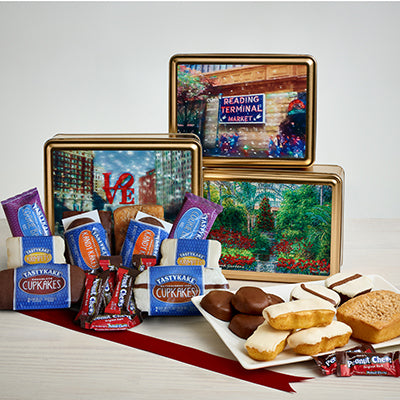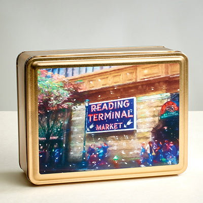 These collector’s tins, by artist, Lois Mauro, depict Philly’s favorite institutions. The iconic Love Park, the Museum of Art and the City Skaters, these tins are filled with memories of our favorite childhood treats, Tastykakes and Goldenberg’s Peanut Chews.